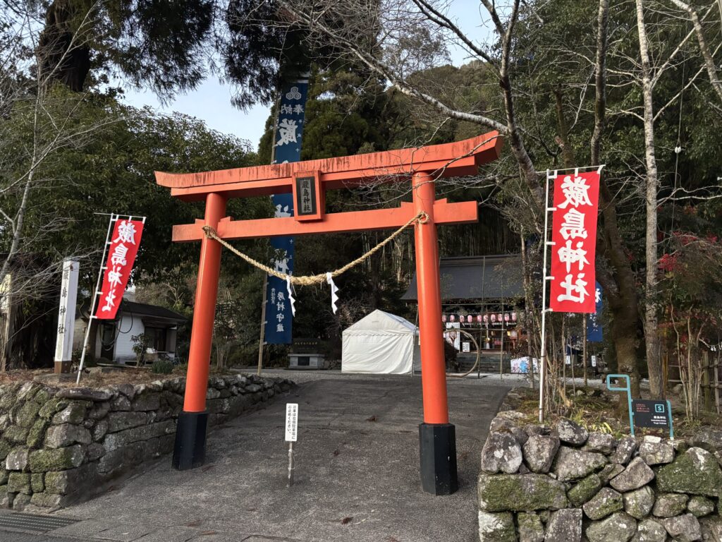 大阪に向けて鹿児島空港に行く途中で、後続車両が気になって道路左側に寄せたところ、目の前に厳島神社があった。