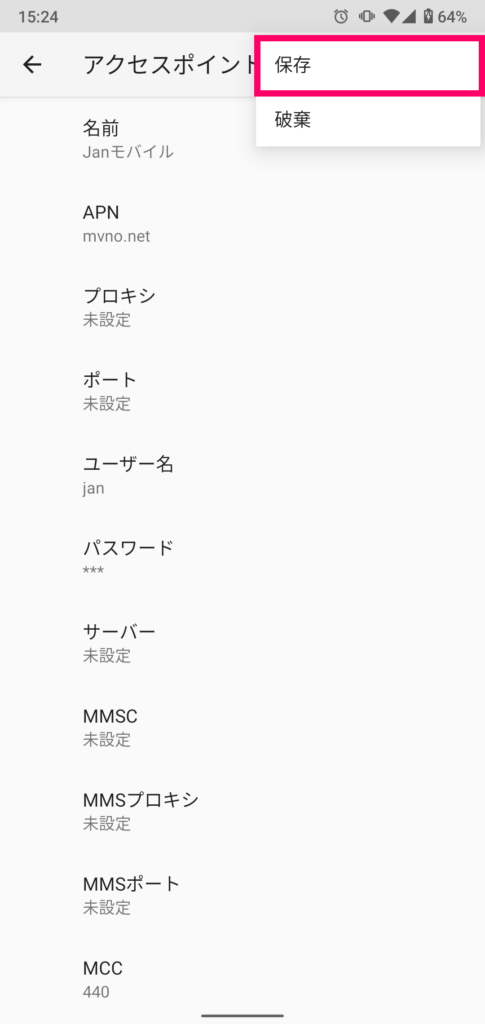 APN画面で最初に「⋮」をクリックして→新規APN作成の画面で、アクセスポイント情報を入力したあと、右上の「⋮」をクリックして「APNを保存→作成したAPNを選択」という手順が出来ていなかったことでした。